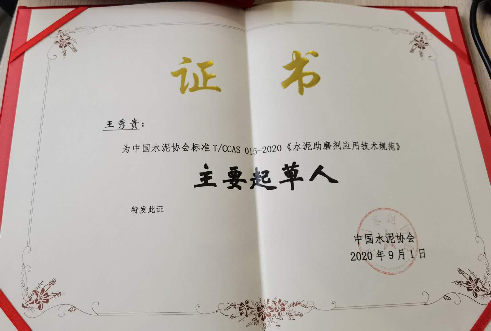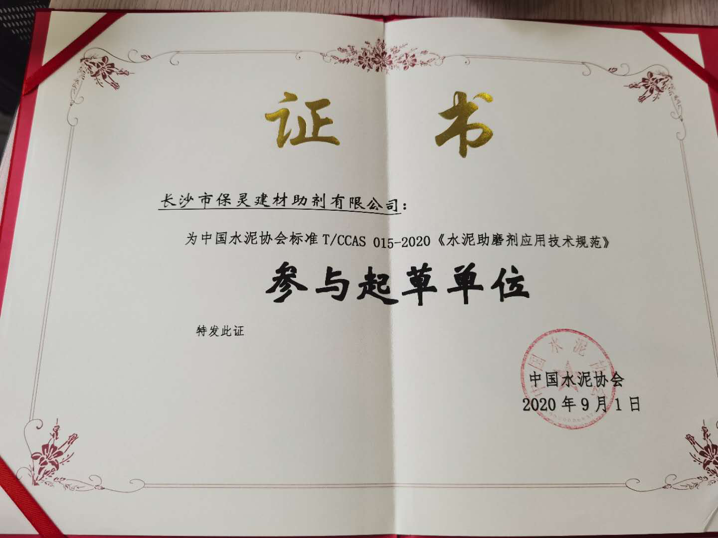 我司在為中國水泥協(xié)會(huì)標(biāo)準(zhǔn)T/CCAS 015-2020《水泥助磨劑應(yīng)用技術(shù)規(guī)范》做出重要貢獻(xiàn),被授予:參與起草單位