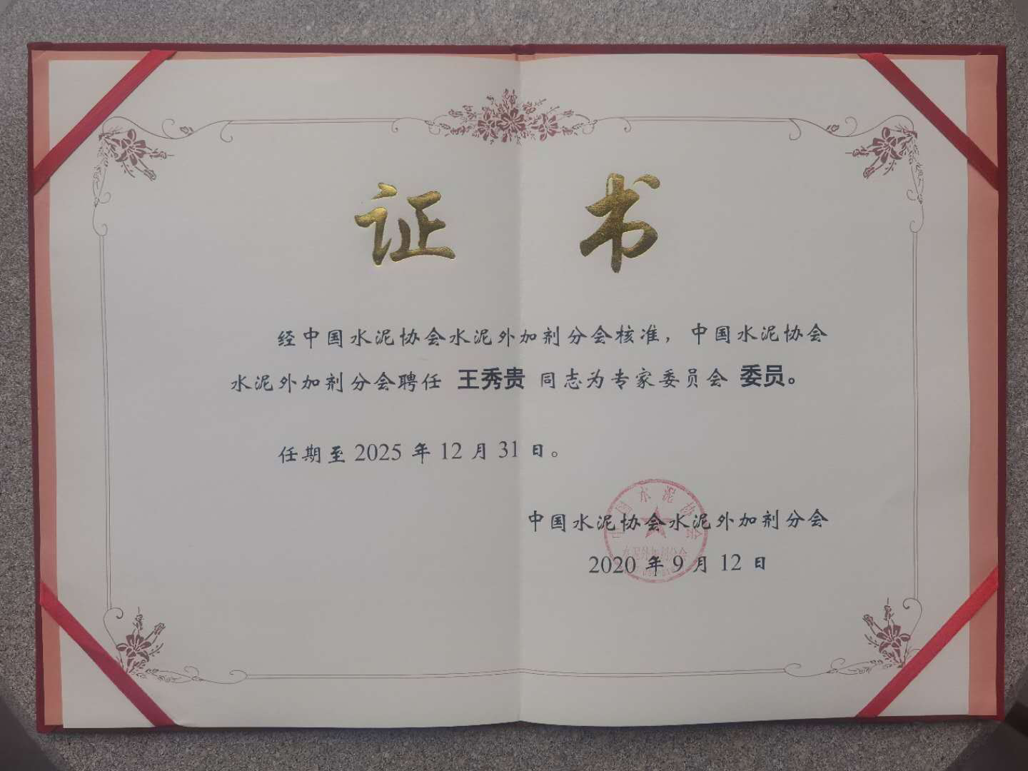 2020年9月經(jīng)中國水泥協(xié)會外加劑分會核準(zhǔn),中國水泥協(xié)會水泥外加劑分會聘任長沙保靈建材助劑有限公司董事長王秀貴先生為專家委員會委員。